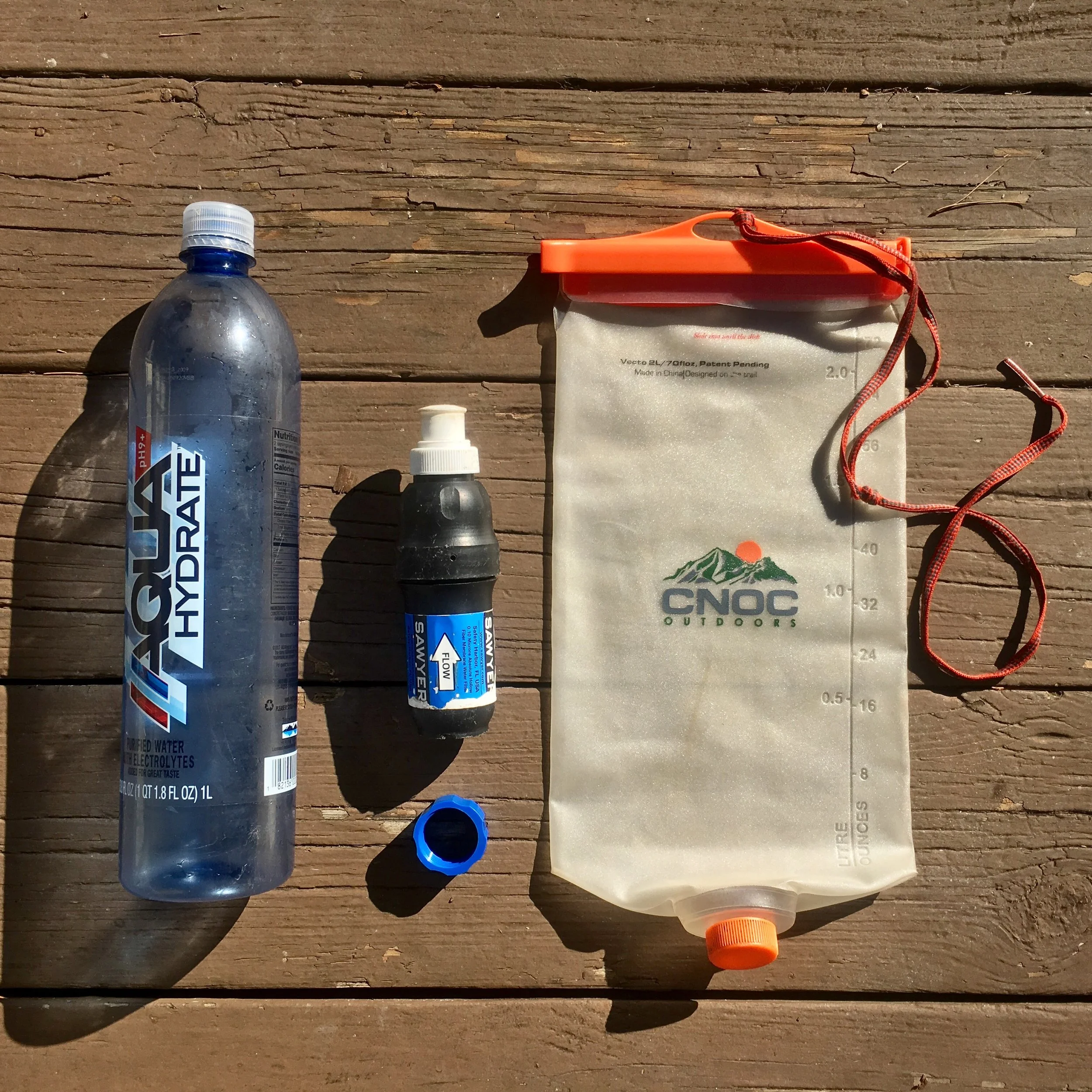 My first pick is more like three pieces but for one purpose: a hands-free water filter system. On the Appalachian Trail, I loved the Sawyer Squeeze but I hated squeezing water bottle to water bottle. Eventually, I added a Cnoc 2L pouch in Marion, Virginia, and a Sawyer coupling piece and I finally nailed it. The Cnoc pouch makes it easy to roll and squeeze through the filter, coupling piece, and into the clean water bottle.